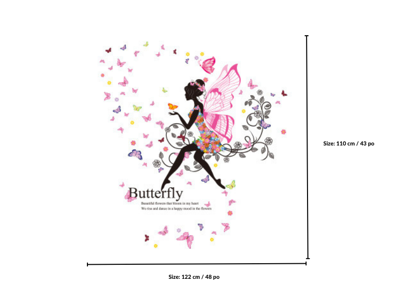 Auto-collant et décalque mural qui contient plein de papillons ainsi qu’une fille. Ce modèle est idéal pour la décoration intérieure de la chambre à coucher de votre fille.